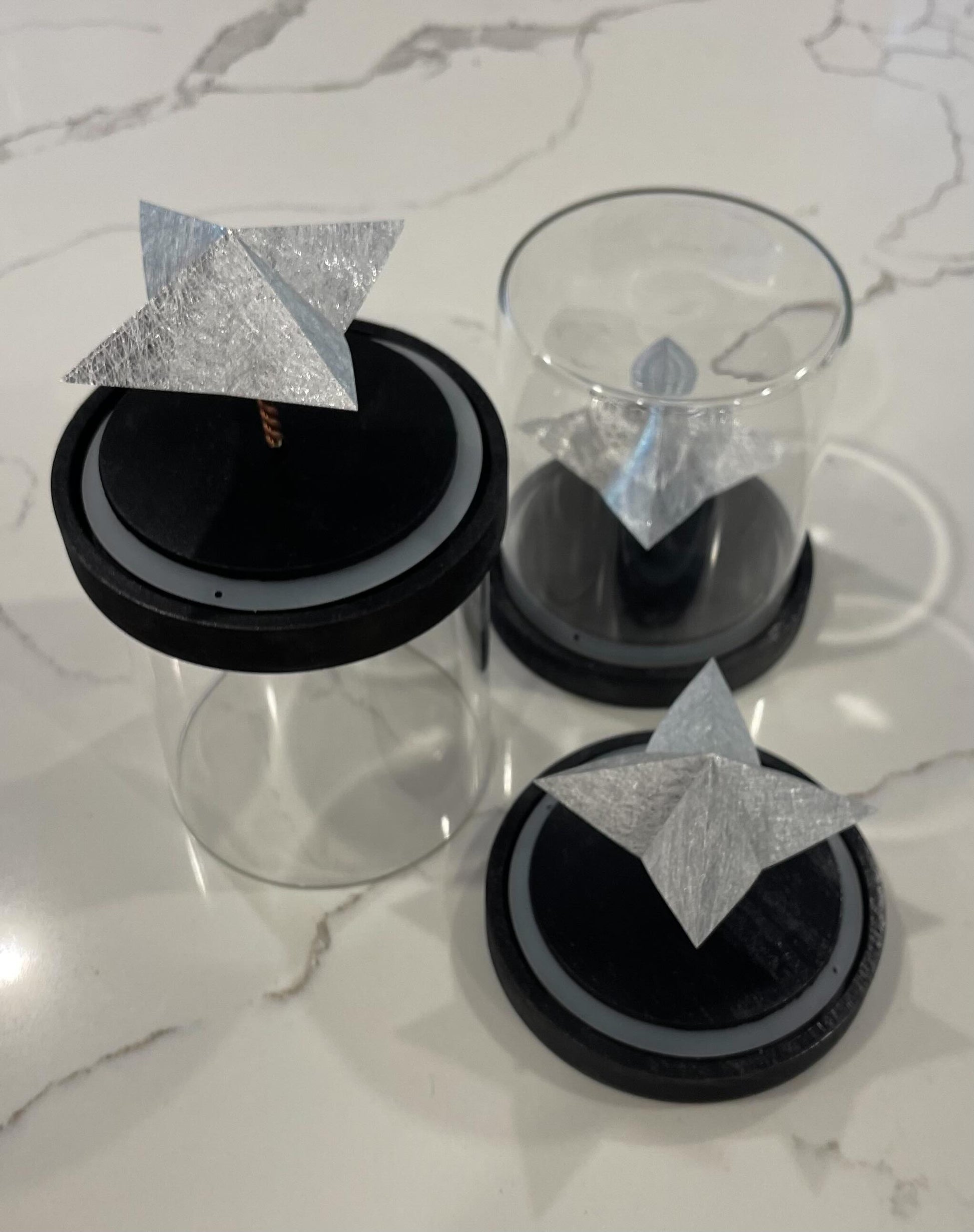 Glass vacuum enclosed PSI wheel housing with black painted wooden base and a hand made tensor post and our discontinued silver filament origami